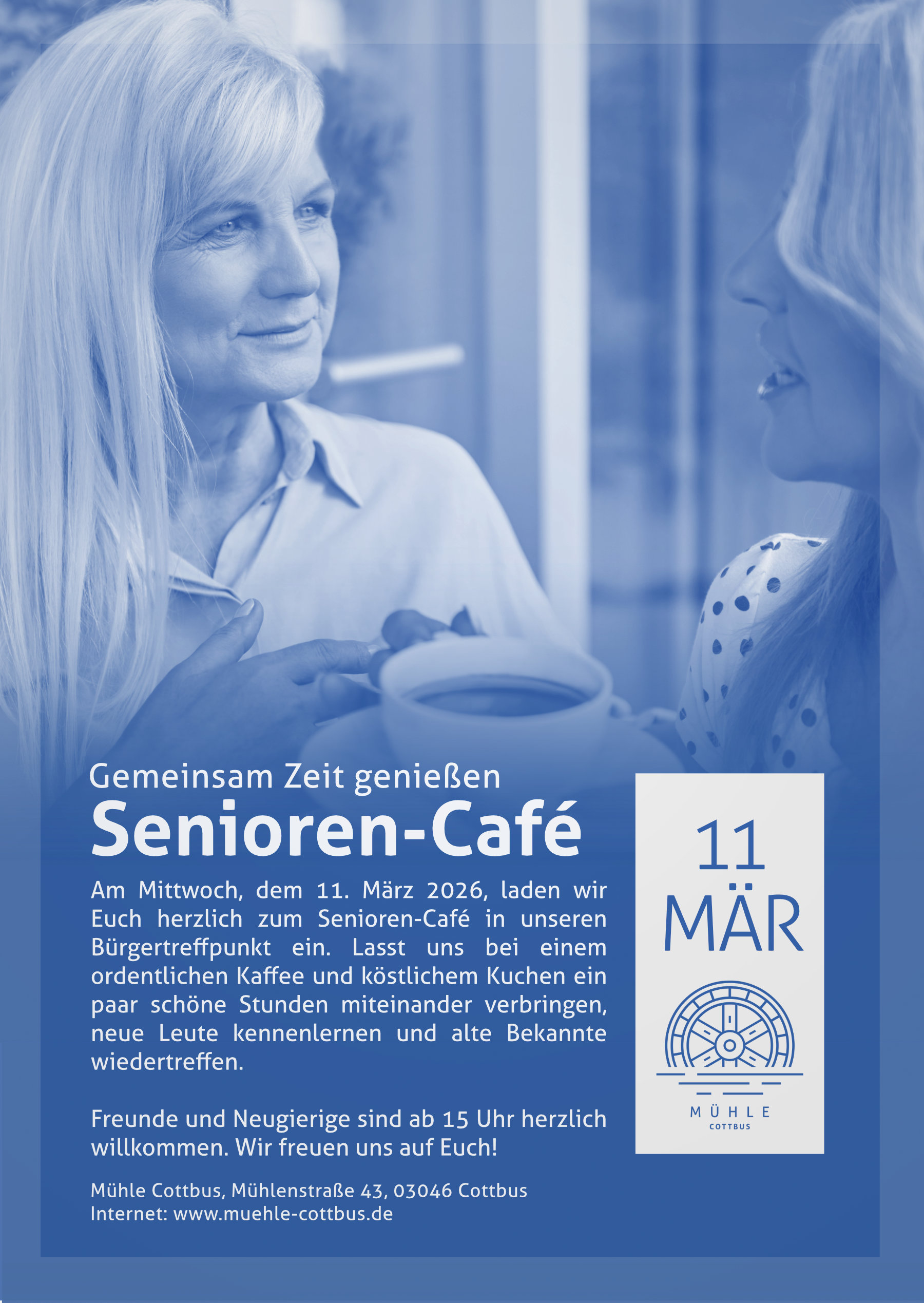 Am Mittwoch, dem 11. März 2026, laden wir Euch herzlich zum Senioren-Café in unseren Bürgertreffpunkt ein. Lasst uns bei einem ordentlichen Kaffee und köstlichem Kuchen ein paar schöne Stunden miteinander verbringen, neue Leute kennenlernen und alte Bekannte wiedertreffen.